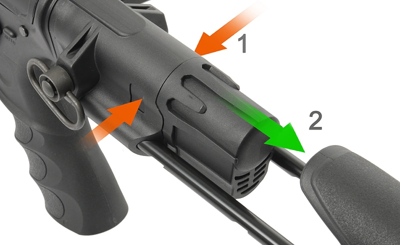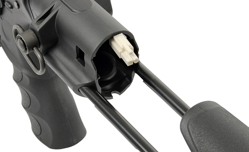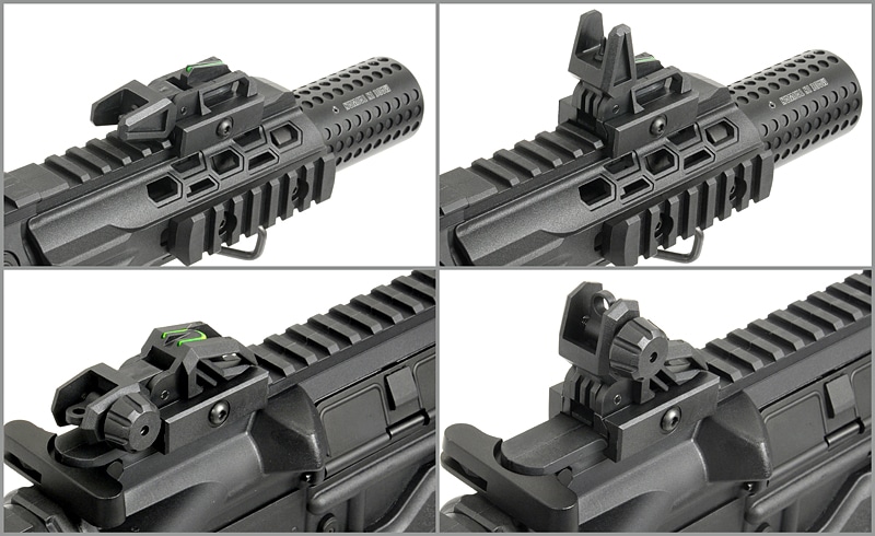 Für taktische Vielseitigkeit verfügt das Gewehr über gut sichtbare, klappbare Fiberoptik-Leuchtvisiere, einen dreifach verstellbaren PDW-Schaft mit robusten Metallbeinen sowie vordere und hintere QD-Riemenbügel aus Stahl für taktische Trageriemen.