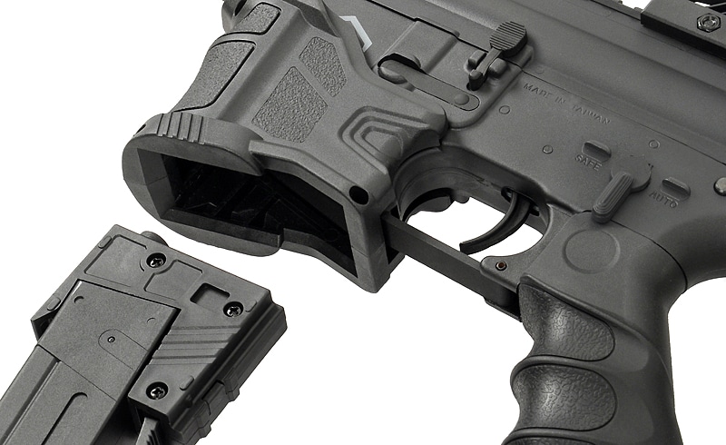 Sie ist sowohl mit SRC Falcon-SMG-Magazinen als auch mit Standard-M4-Magazinen kompatibel und wird mit einem SMG-Magazinadapter sowie einem 280-Schuss-SMG-High-Cap-Magazin geliefert.